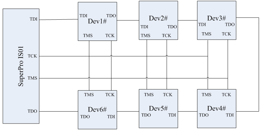 一些应用中会将多个可编程器件以JTAG菊花链的形式级联在一起,需要对JTAG链中的一个或几个器件编程。典型应用示意图